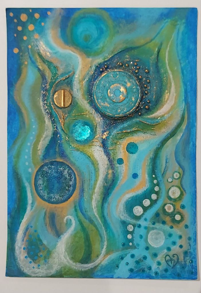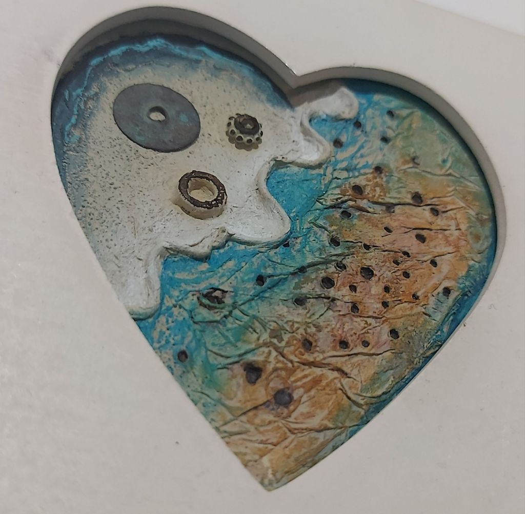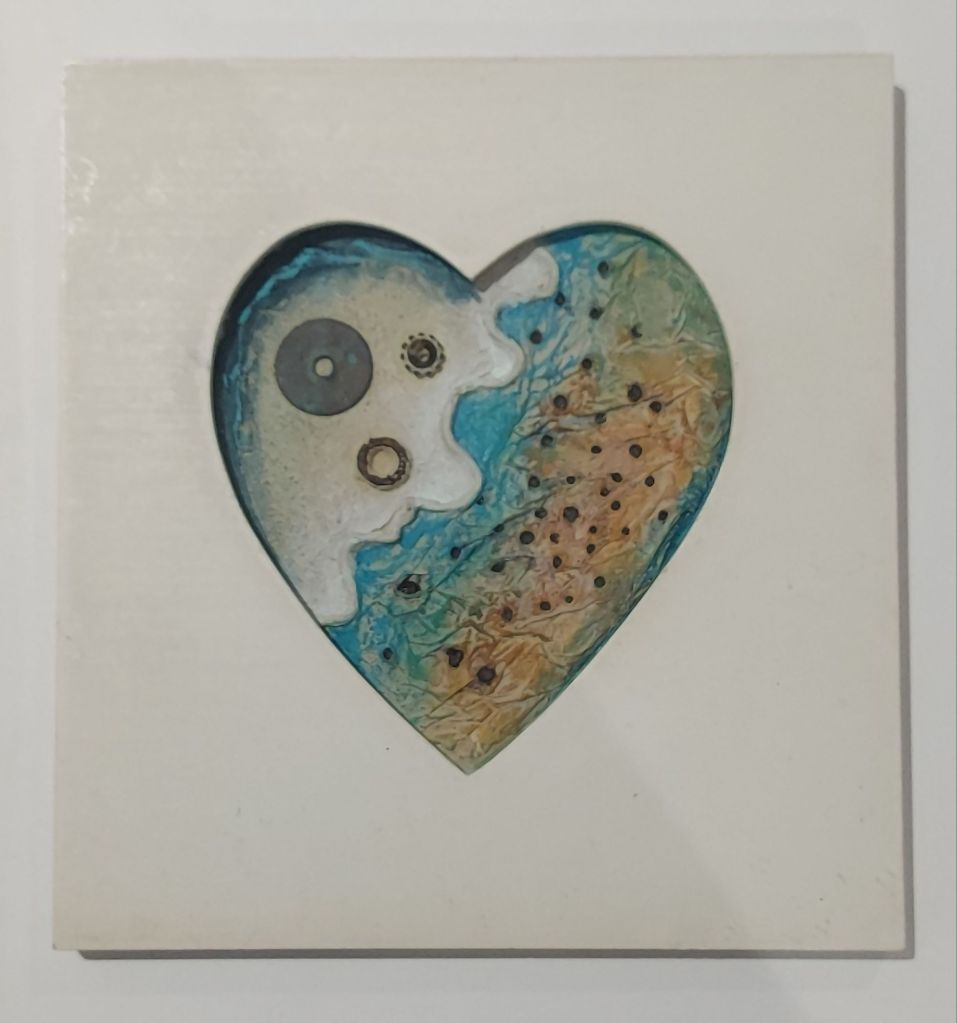 The first image in the heart frame was just made to fit the frame, which I found at a car boot sale and thought was cute as I’ve always loved anything heart shaped. It’s composed of a plastic sweet packet which I covered with tissue paper then burnt holes in, a twisty tie thing that might have been holding cables together at some point, some old beads, a washer with a pretty patina that I’ve just stuck on as it was rather than painting over it as I like it so much, some old cement and tile grout, and acrylic paint.
