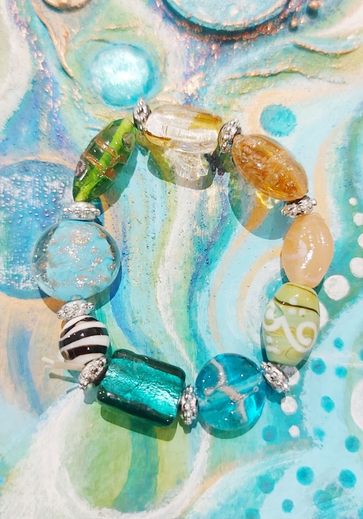 The second image seemed to take a ridiculous amount of time… lots of layers of paint on this, the colours were inspired by this bracelet that I found, also at a car boot sale: