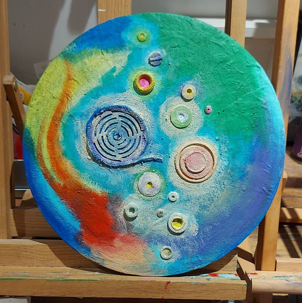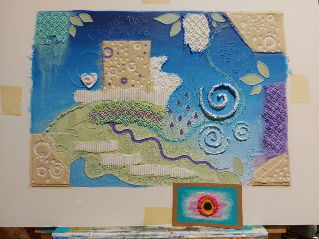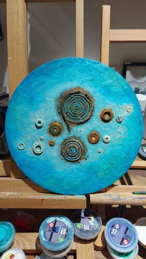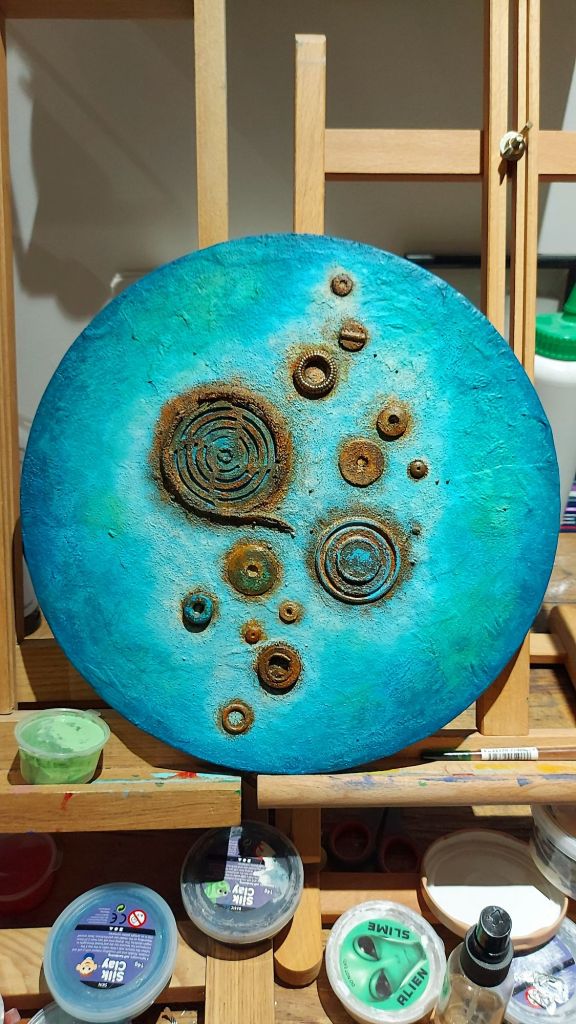 Anyway here is the painting so far. It still has a long way to go and I’m really not sure whether I like the spiral or not!