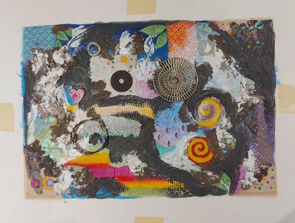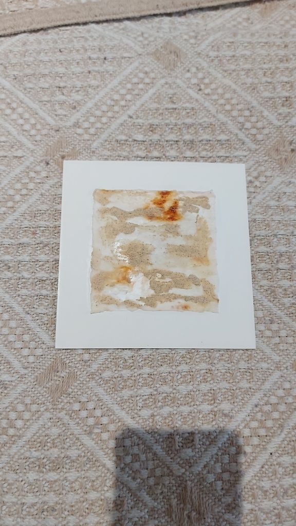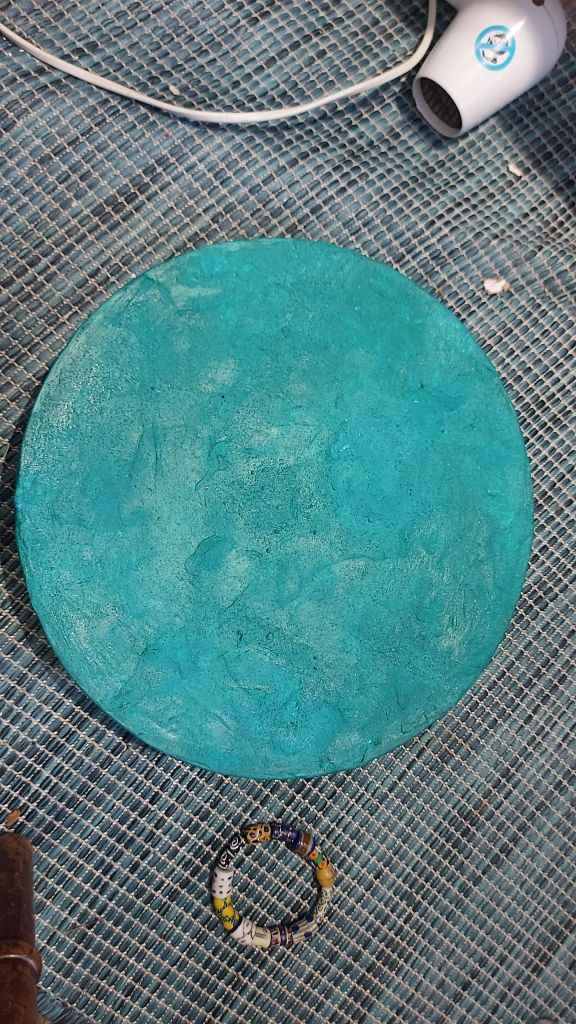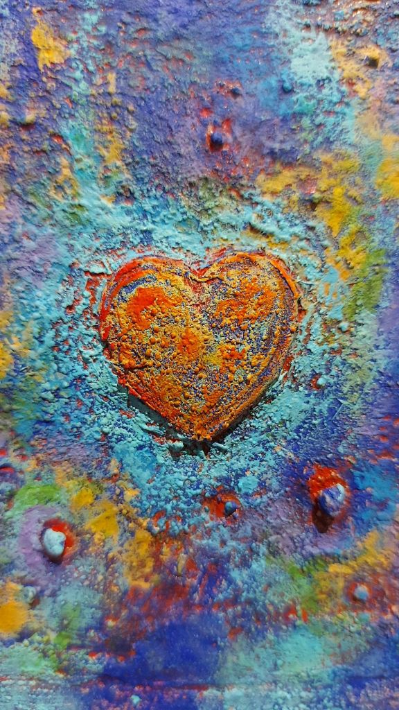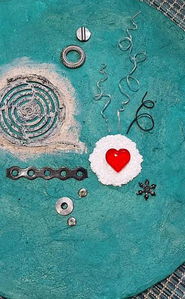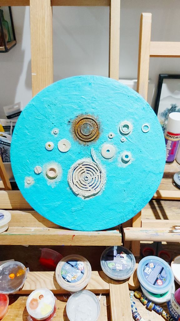 I was so engrossed I forgot to take many pictures! I didn’t use many materials, just a baby wipe that had been used to wipe up some spilt hair dye, some old cement sand mixed with paint, some old tissue paper and a variety club charity heart badge which I removed the pin from. I quite like how it turned out but felt it could have looked more authentically rusty, so I then continued working on my old cake board…