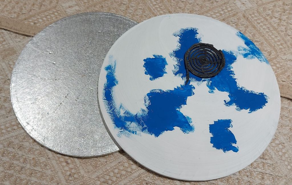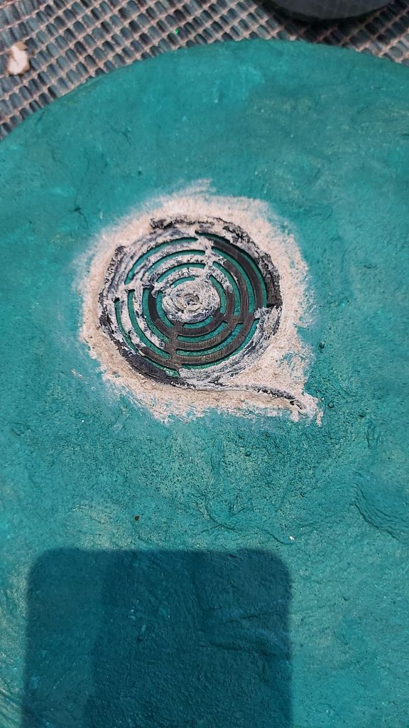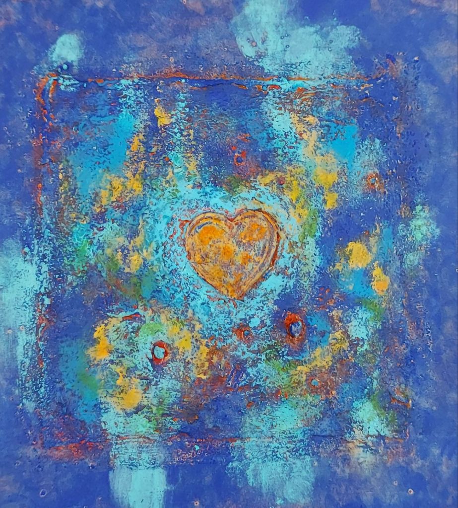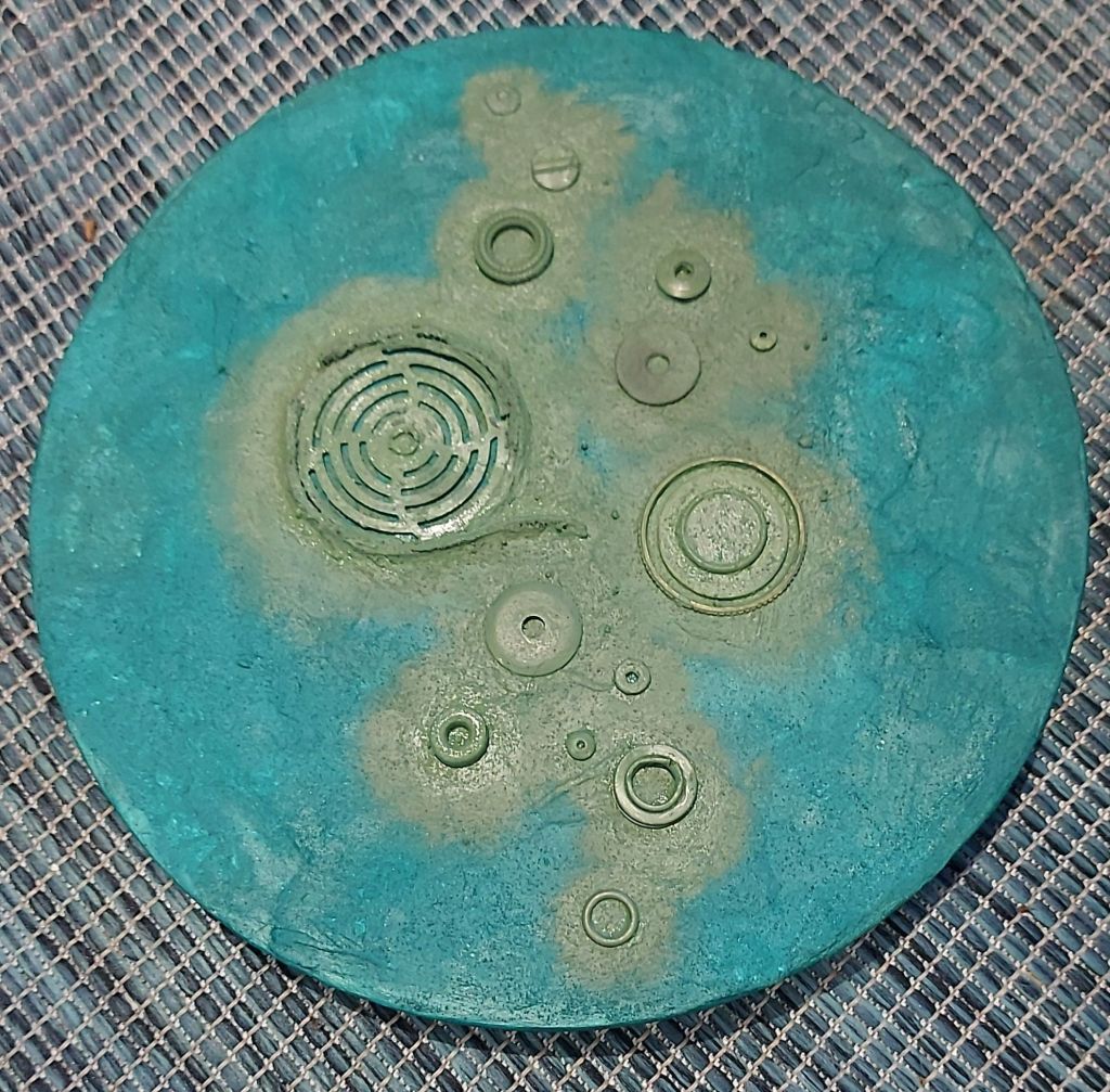 I was so engrossed I forgot to take many pictures! I didn’t use many materials, just a baby wipe that had been used to wipe up some spilt hair dye, some old cement sand mixed with paint, some old tissue paper and a variety club charity heart badge which I removed the pin from. I quite like how it turned out but felt it could have looked more authentically rusty, so I then continued working on my old cake board…