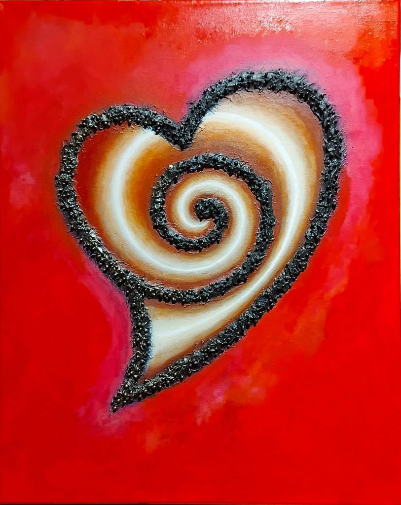 Fortunately, it hasn’t stopped me creating altogether as I thought I ought to make a start on another painting a friend has asked me to do. I thought this one might be easier as she didn’t really give me any criteria for what she wanted. I knew she liked another piece that a mutual friend of ours has and that her living room has lots of red decor, so I came up with a spiral heart design that uses similar techniques to those I used for our friend’s piece. I have always loved the colour red but for some reason am not often moved to use it in my paintings so I have been tinkering around with ways of using different shades and doing some red doodles.