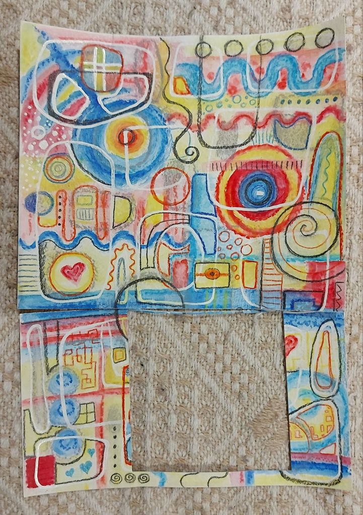 And lastly I needed to make a birthday card for my friend who is colourblind, so I doodled with primary colours as I heard that they are most easily seen and I know he finds differentiating between red and green hard. I then cut a section out of the doodle and framed it on the front of the card. I already gave him the card so here is what is left!