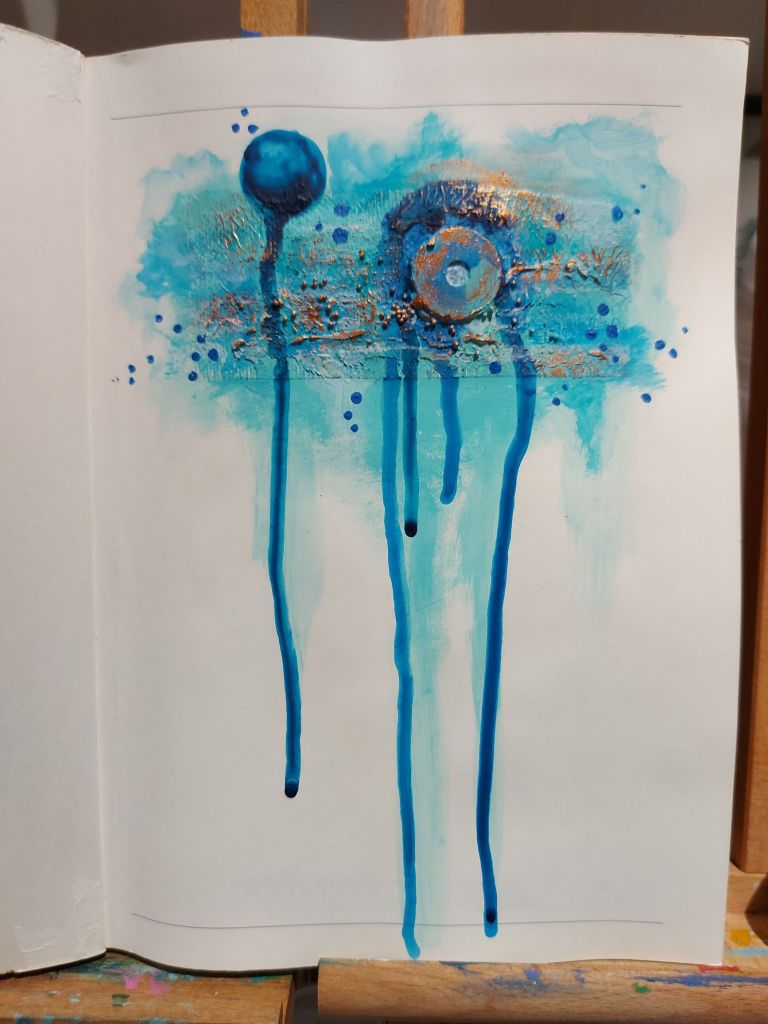 However, I have managed to finish off a circular painting I began years ago, as well as start a new sketchbook and go on a treasure hunt for objects to work into a painting and do my daily sketch, so it hasn’t been a disaster!