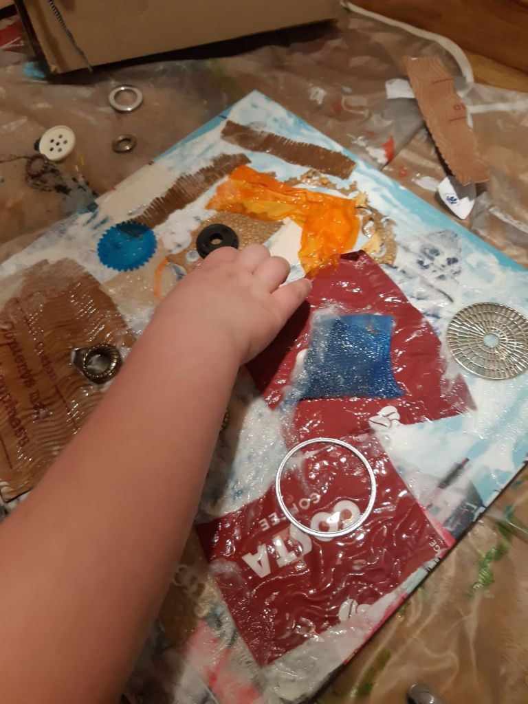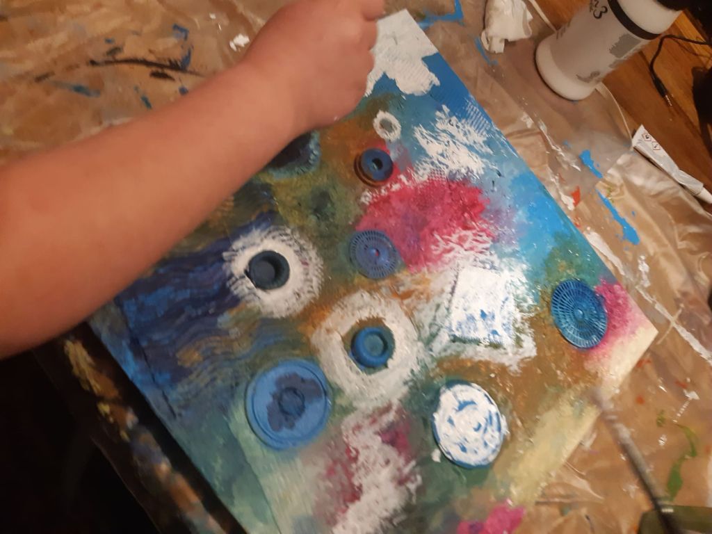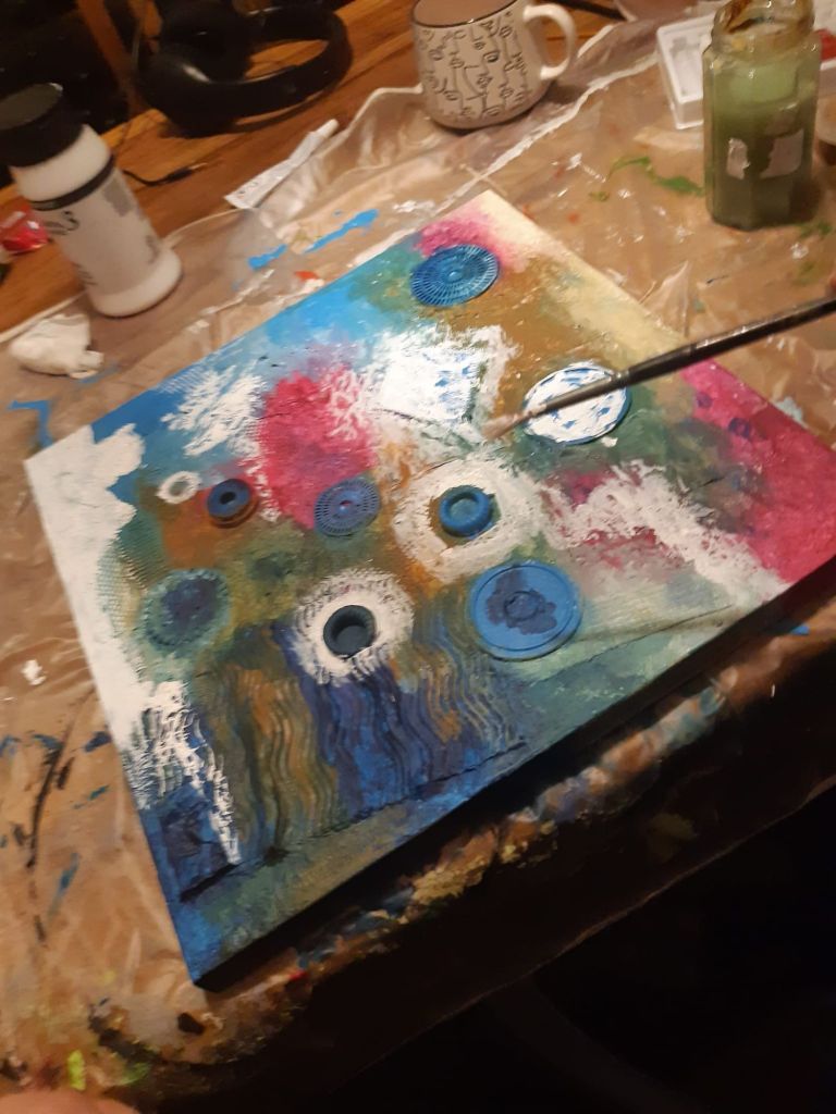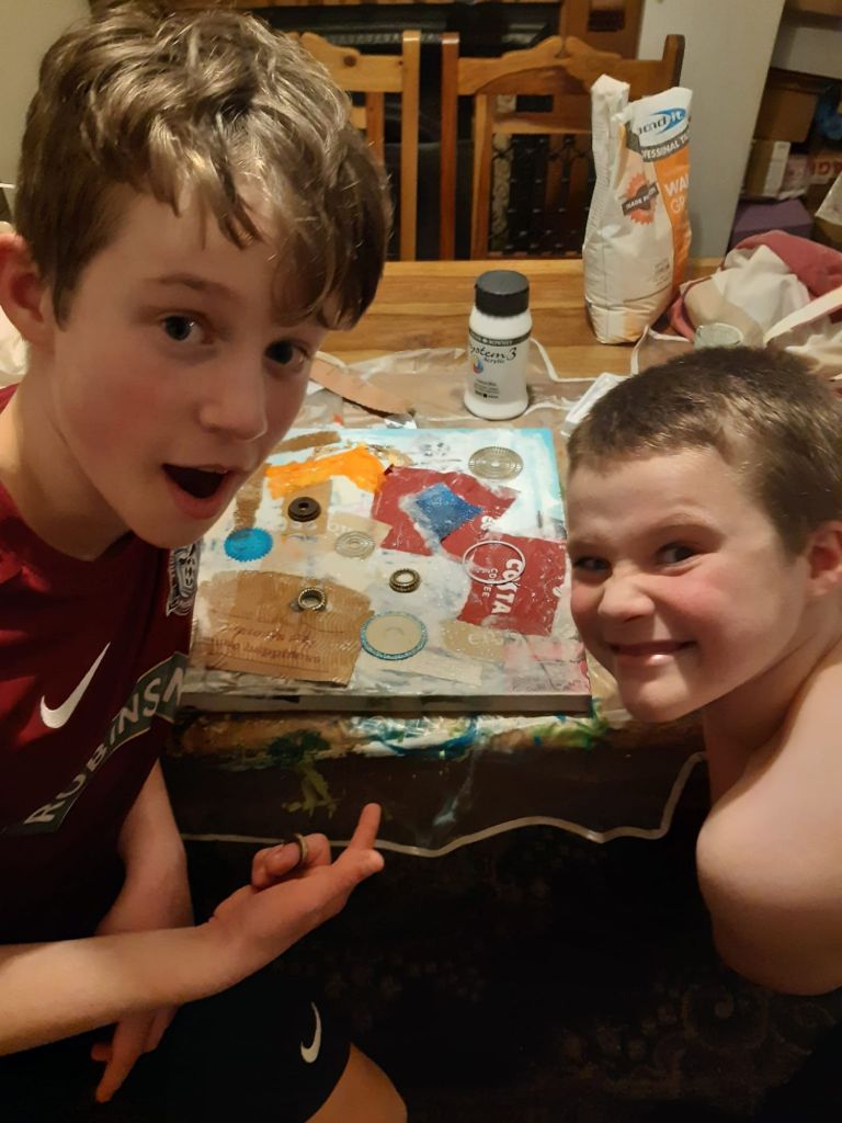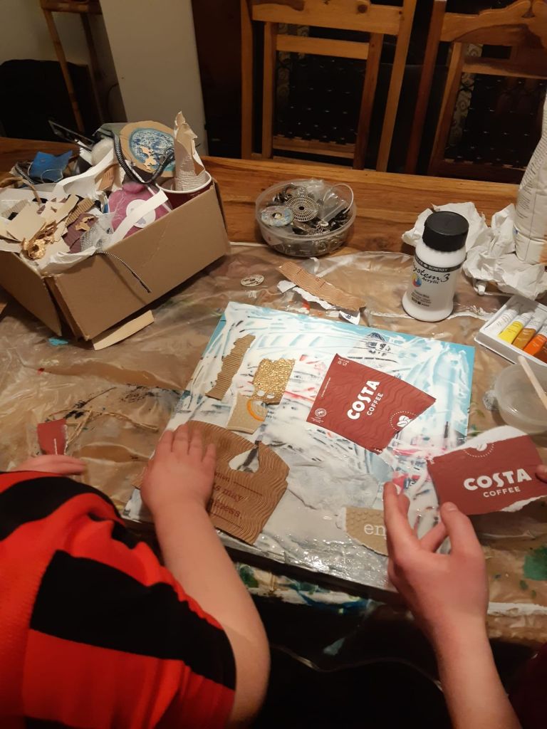 Jesse got to work mixing up some grout with pva glue, then he and Remy both smeared that over the canvas, ready for a layer of different cardboard, tissue paper and other textured papers, which all got slathered in copious amounts of pva mixed with water and the whole thing was very soggy! They then chose some circular bits and pieces and stuck them where they wanted over the top and ran off to play Fortnite 🙄 whilst I dried it all with my heat tool.