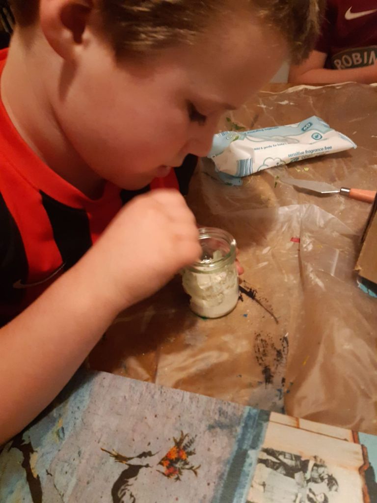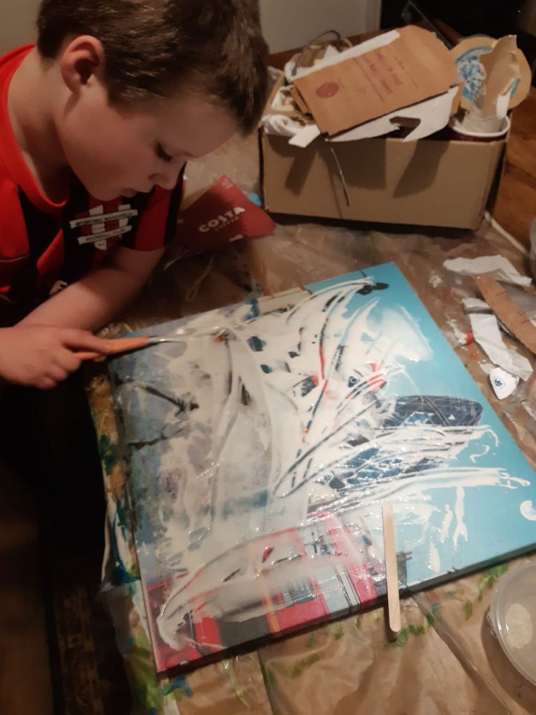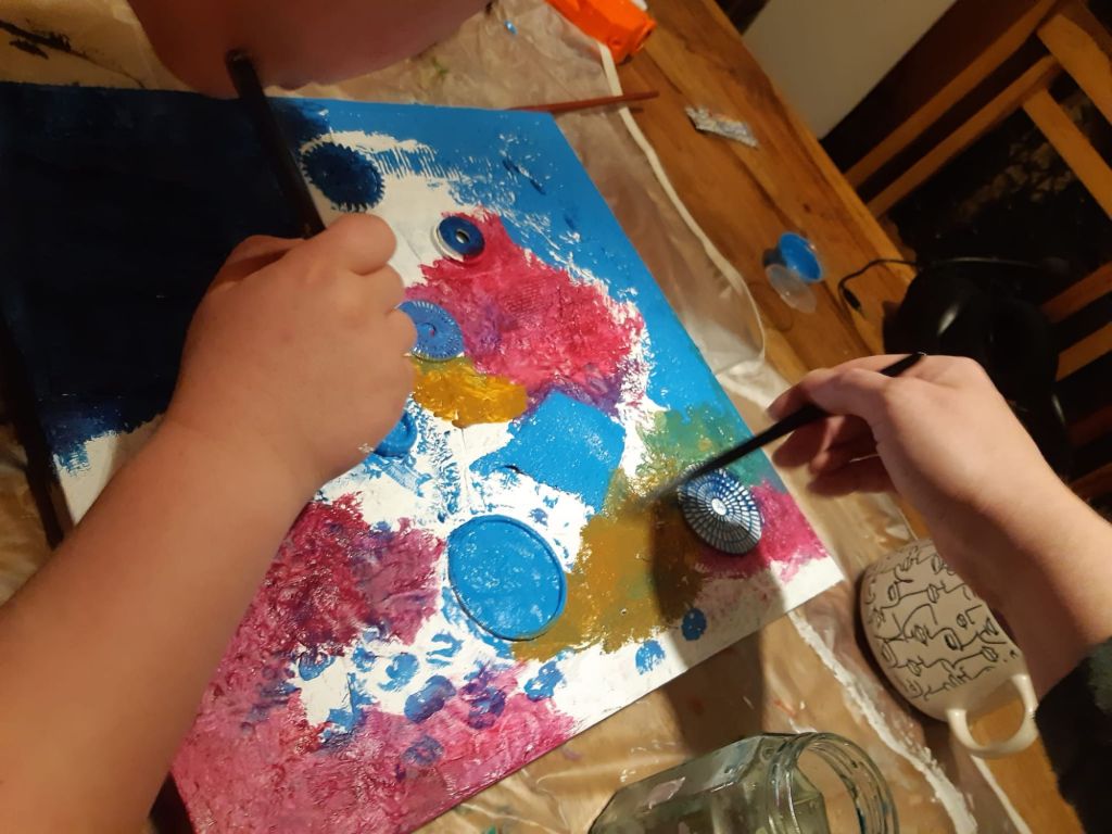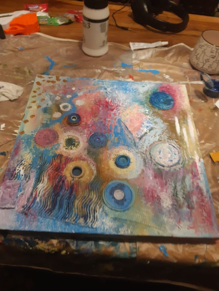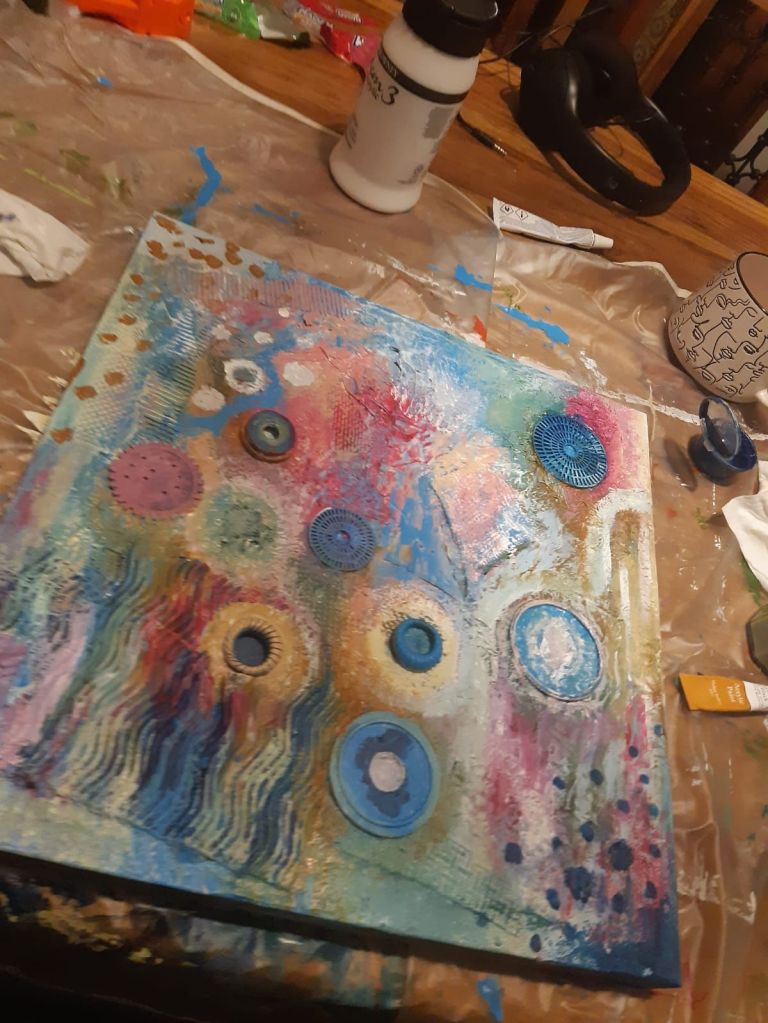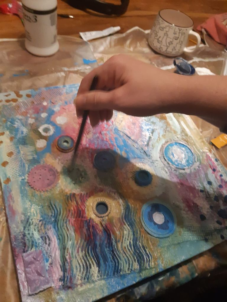 Jesse got to work mixing up some grout with pva glue, then he and Remy both smeared that over the canvas, ready for a layer of different cardboard, tissue paper and other textured papers, which all got slathered in copious amounts of pva mixed with water and the whole thing was very soggy! They then chose some circular bits and pieces and stuck them where they wanted over the top and ran off to play Fortnite 🙄 whilst I dried it all with my heat tool.