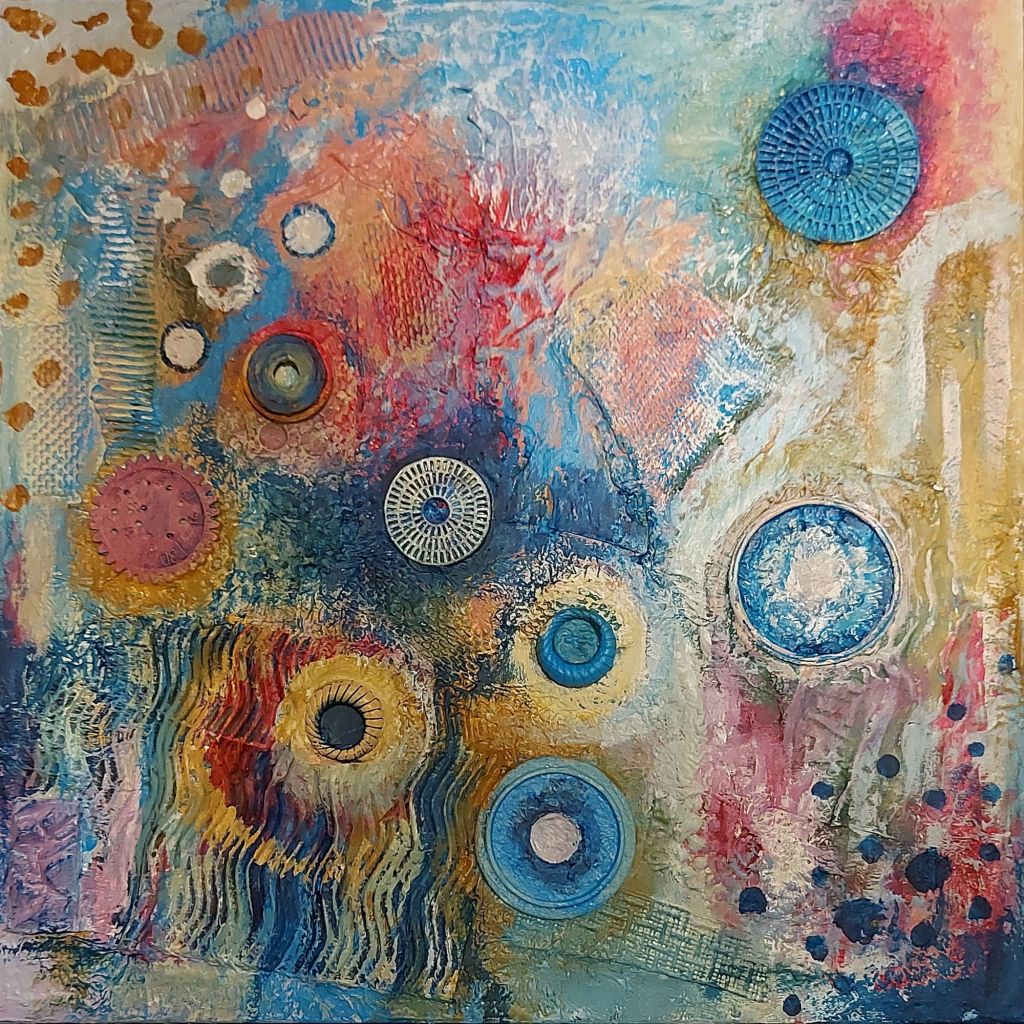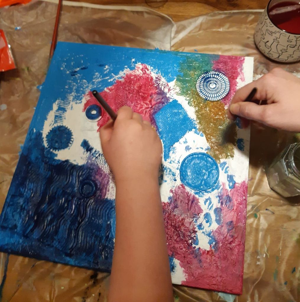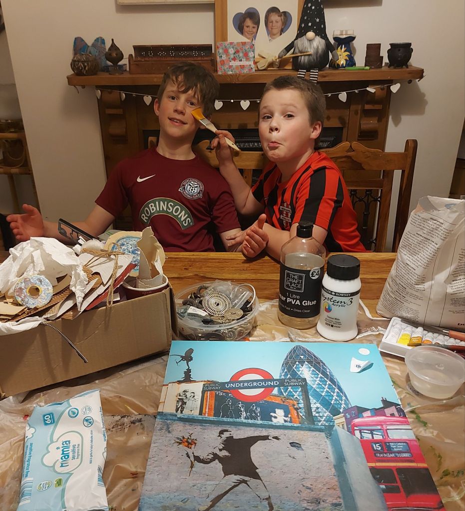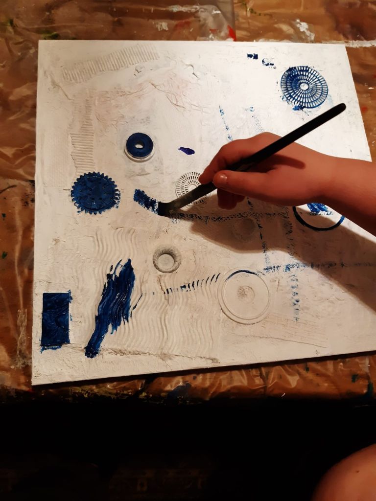 Jesse got to work mixing up some grout with pva glue, then he and Remy both smeared that over the canvas, ready for a layer of different cardboard, tissue paper and other textured papers, which all got slathered in copious amounts of pva mixed with water and the whole thing was very soggy! They then chose some circular bits and pieces and stuck them where they wanted over the top and ran off to play Fortnite 🙄 whilst I dried it all with my heat tool.