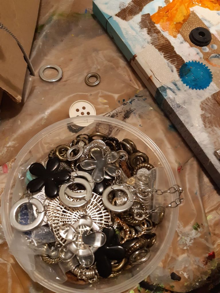 I got out the messy mat, found a charity shopped canvas and gathered some old tile grout, a couple of boxes of recycled bits and bobs, some paint, brushes and glue and laid it all out on our dining table.