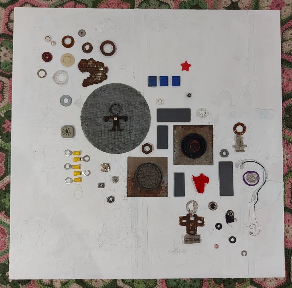 I’ve also been working on the first of the series I plan to do using bits I find whilst out with my friend Jade whilst she’s litter picking. It seemed to take a very long time to prime the board, probably because it was covered in a very thirsty fabric!