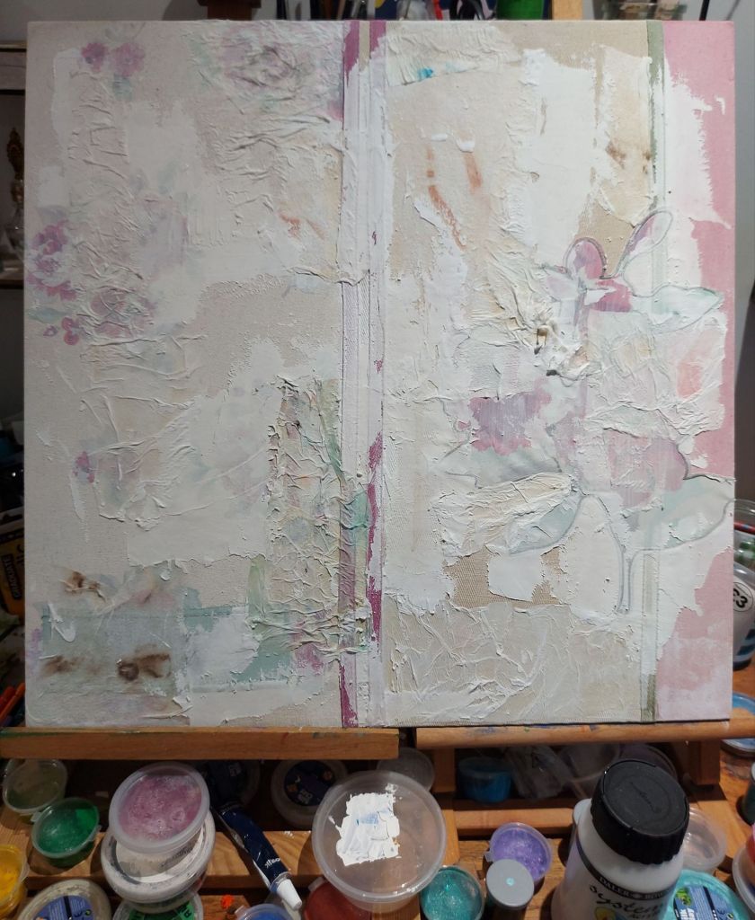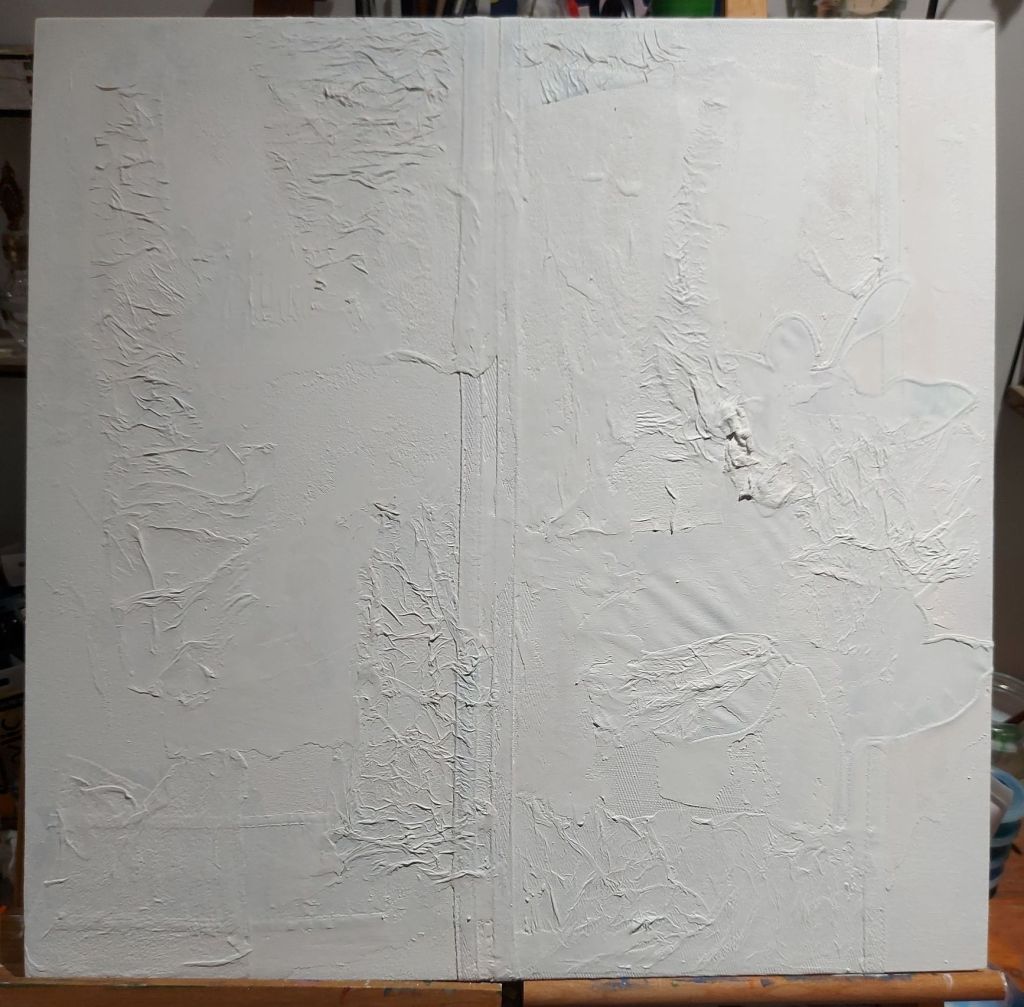 So now I will paint over the whole lot and decide if it needs any further textured bits before adding colour. No idea at this point what colour palette to go with, maybe something that says ‘urban decay’!